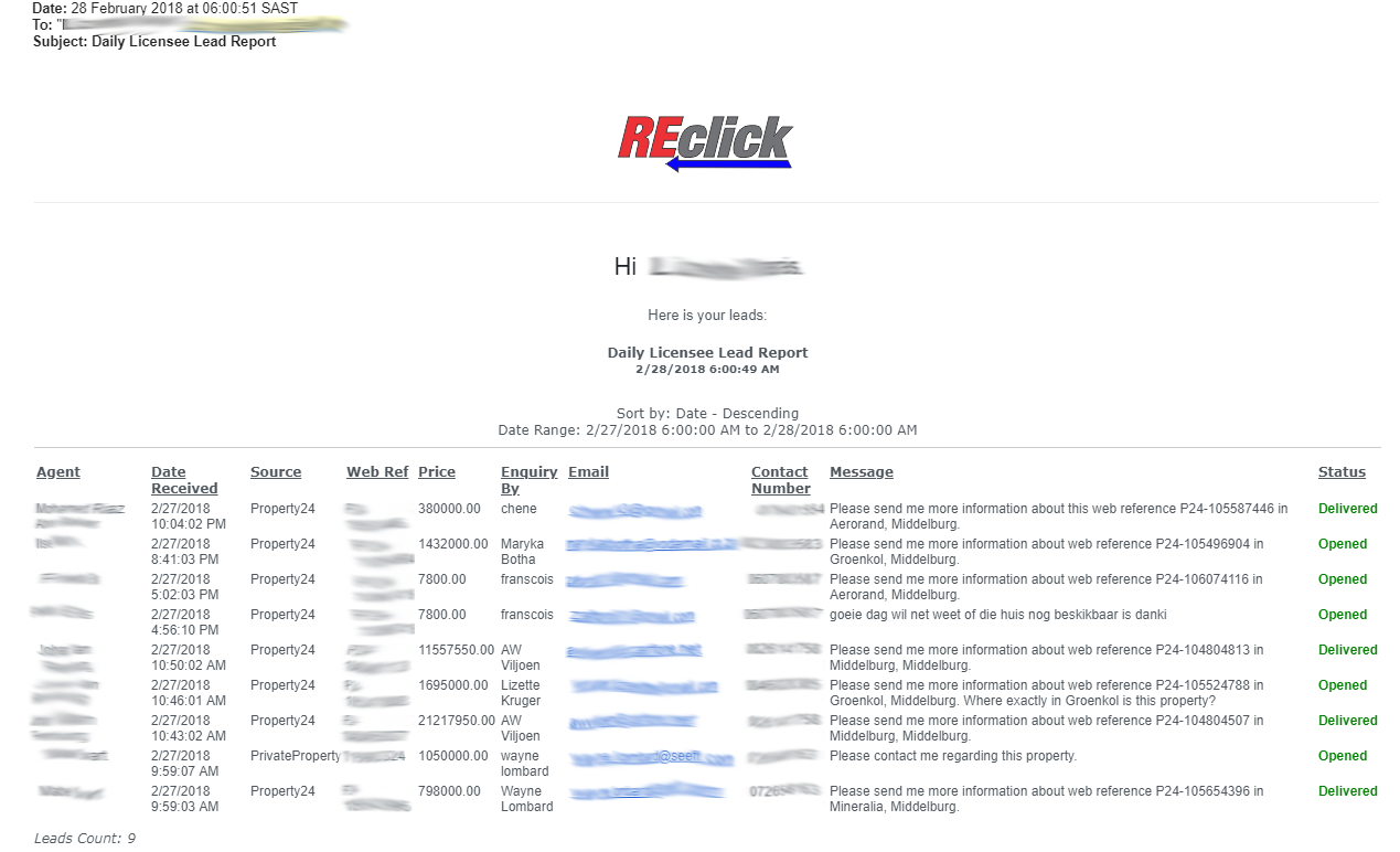 Every morning at 6 am, the licensee and admin receive a daily snapshot report for all the agent inquires for the entire branch for the last 24 hours. The agents also receive their individual daily snapshot report displaying only their leads from the last 24 hours. These reports are super valuable in the lead management process. Every Sunday morning REclick sends a consolidated weekly “Leads received” report to Licensee, Admin and agents.  This report allows the Licensee and agents to see all the leads received during the week.